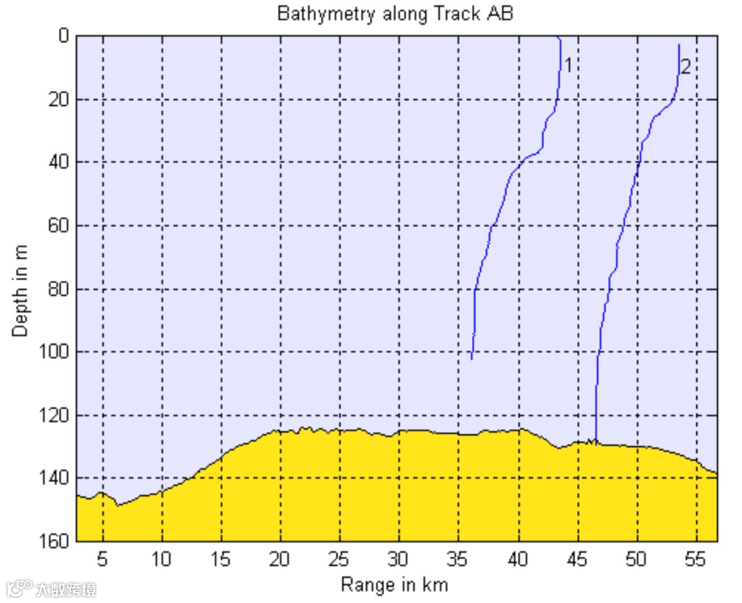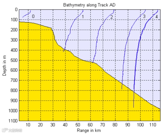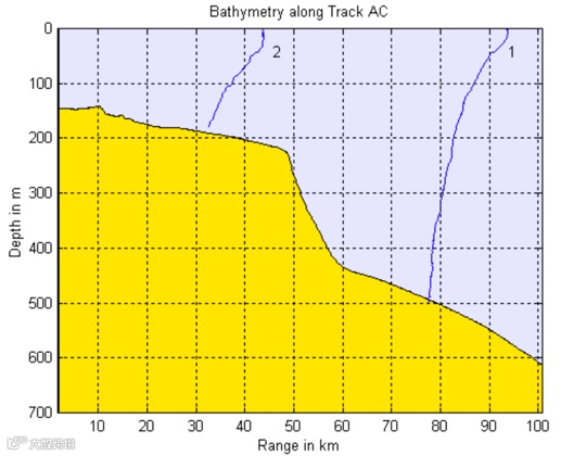 以2002年5月在南海进行大型海洋调查试验为例,试验中不同航线的海深分布可以看出,在100公里范围内,由于海底地形的不同,海深变化差异性很大。