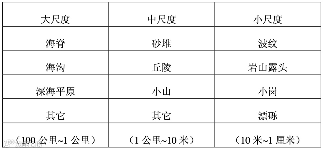 由于地壳运动作用,不同海域或者同一海域不同站点的海底地貌差异很大。海底粗糙度范围很广,大体分类下表所示。