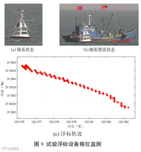 从图 7 中同时发现试验浮标有移位现象,通过前后取证图像对比及轨迹分析,如图 9 所示,判断在该时间段内合作船只对试验浮标进行了维护作业,试验浮标由锚系状态变为随船漂流状态。