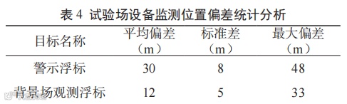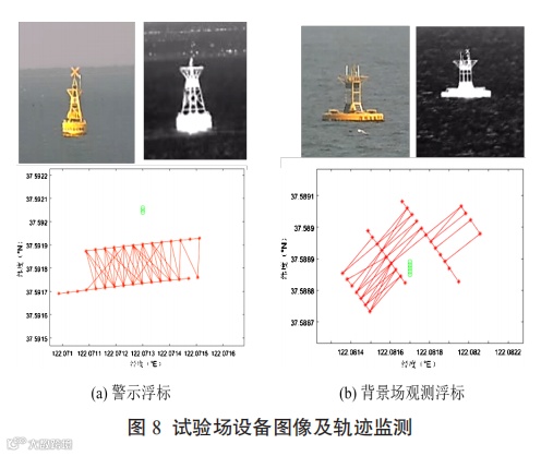 从图 7 中轨迹分布情况来看,目标监测系统能够准确识别试验场在位运行设备的位置,选取装有 AIS 设备的警示浮标和背景场观测浮标,分析同步监测的雷达轨迹与 AIS 轨迹(如图 8 所示),以 AIS 探测位置为基准值,雷达监测位置偏差的平均值、标准差和最大值统计结果如表 4 所示。根据监测轨迹和统计结果,雷达监测位置平均偏差在 30 m 以内,位置分布比较集中,其中最大偏差值较大主要是由于浮标附近船只目标遮挡造成的误检。根据现场取证效果,监测精度能够满足系统取证和识别需求,热成像和可见光取证图像如图 8 所示。
