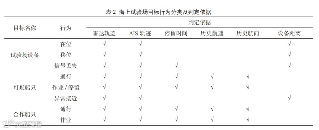 在目标行为判别步骤中,首先对海上试验场的监测目标进行分类,主要分为试验场设备、可疑船只和合作船只 3 大类,并利用决策树算法判断每一类目标的具体行为,如表 2 所示。