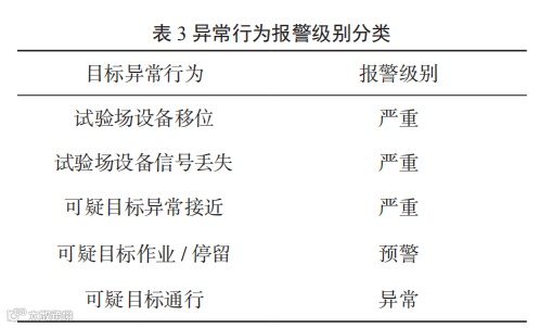根据试验场设备的受威胁程度可分为严重、预警和异常 3 个报警级别,见表 3,对于识别的目标异常行为系统首先进行取证和存储,对于预警和严重级别的报警,系统进一步跟踪监测。通过海上目标异常行为分析,可以实现对海上试验场设备整体状态的实时监测,也有利于对违法破坏行为进行重点监测,提高取证效率。