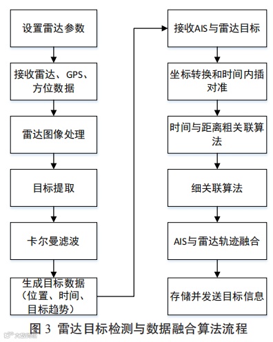雷达采用双量程工作模式,兼顾近距离试验场内目标高分辨率探测和远距离试验场周边整体态势感知。雷达目标检测主要包括雷达目标提取和 AIS与雷达轨迹融合两部分,具体流程如图 3 所示。