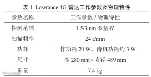 在海上目标监测中,雷达属于主动探测设备,既可以探测合作目标(加装 AIS 的船只),也可以探测非合作目标。受到海上平台安装条件及能源配置限制,一般的 X 波段导航雷达在功耗、体积和重量方面均难以满足要求。本文选用美国Lowrance 公司生产的 4G 小型连续波雷达,该型雷达采用固态发射机和连续波探测技术,拥有极低发射功率。具体工作参数及物理特性如表 1 所示。