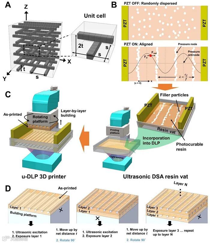 近日,基于超声场辅助的3D打印技术,研究人员提出了一种非连续互穿相复合材料,“discontinuous” IPC,简称为d-IPC材料。与传统IPC不同,d-IPC的中增强体组元由非连续的颗粒组成。为了制备d-IPC材料,研究人员首先对DLP 3D打印机进行了改装,添加了超声场辅助定向自组装装置(Fig. 1)。接着研究人员对d-IPC材料进行了打印(Fig. 2A)和实验测试。实验结果表明,与纯树脂材料相比,含有1 wt%陶瓷颗粒的d-IPC材料经过优化后比能量吸收提高了37 J/g。此外,虽然d-IPC材料内部陶瓷颗粒互不相连,但得益于宏观有序的组装方式,材料强度高达68 MPa。与陶瓷颗粒含量相同但颗粒随机排列的复合材料及轻质高强点阵结构相比,d-IPC材料具有明显的优势(Fig. 2B)。