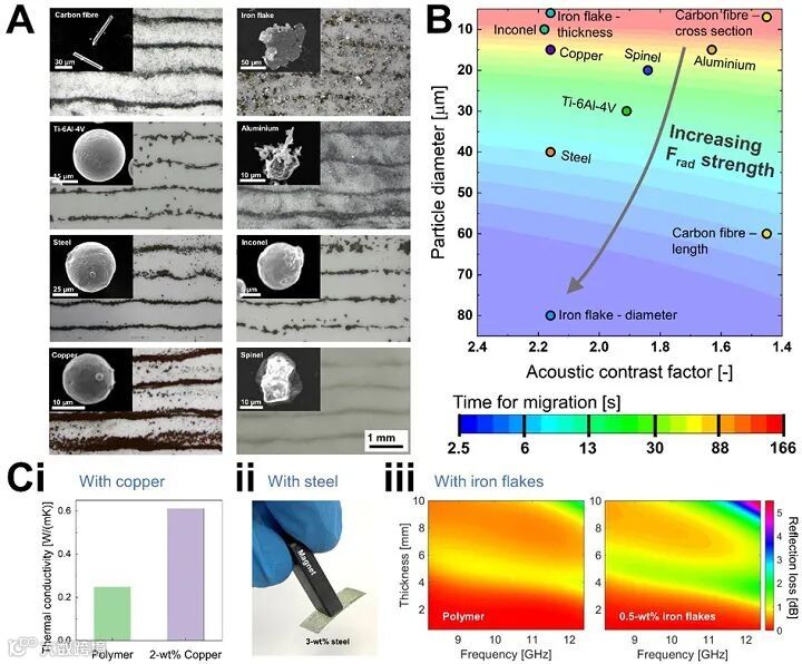 Fig. 3: (A,B) Extended studies for a diverse range of particles and demonstrations of (C) multifunctionalities for enhanced thermal conductivity, magnetism, and microwave absorption.