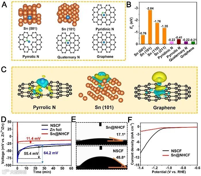 使用不对称电池进一步评估电极的沉积和剥离性能。如图5A所示,在5 mA cm-2的电流密度和5 mAh cm-2的面积比容量下,Sn@NHCF在100次循环过程中具有突出的循环稳定性能,其平均CE高达99.7%。同时,对Sn@NHCF和NSCF进行12 mAh cm-2的预锌化沉积,来评估复合锌金属电极在不同载体上的长期循环稳定性。在1 mA cm-2的电流密度下,Sn@NHCF-Zn电极在370小时内稳定运行,且电压滞后为仅为21 mV(图5B)。然而,由于锌枝晶的脱离或短路,NSCF-Zn和Zn电极在循环约116小时和147小时后均经历随机电压波动和快速电池故障。此外,Sn@NHCF-Zn电极显示出良好的倍率性能,在0.5 mA cm-2到5 mA cm-2的不同电流密度下,电压滞后稳步增加。不仅如此,Sn@NHCF-Zn对称电池还可以在3 mA cm-2的电流密度和6 mAh cm-2的较高面积比容量下实现100小时的稳定循环(图5D)。