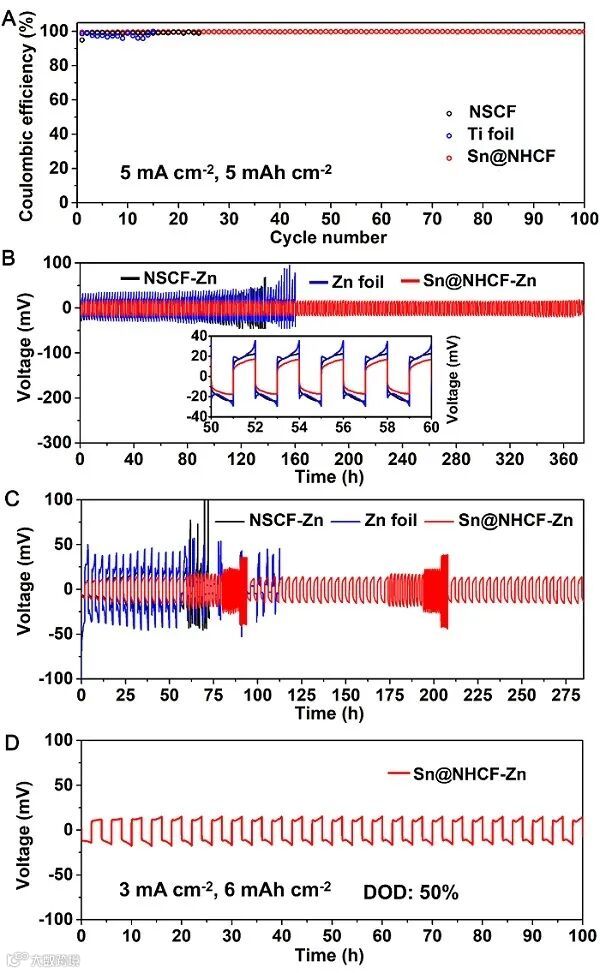 基于上述结果,作者报道了通过多步策略有效制备了嵌入锡纳米颗粒的氮掺杂空心碳球互联三维纤维网络作为亲锌载体。得益于亲锌载体对水分解具有弱的电催化活性、与锌的强相互作用、三维网络减小局部电流密度、以及促进离子转移等优势,Sn@NHCF可以调节锌的成核和生长行为,引导锌在纤维的内外表面均匀沉积。更重要的是,中空纤维内的大量空隙可以缓解370 小时以上长期充放电时的结构应力。同时,在放电深度为30%和50%的情况下,Sn@NHCF-Zn电极仍然可以稳定循环230 h和100 h。此外,由Sn@NHCF-Zn负极和商用V2O5正极组装的水系锌金属电池可以稳定循环2000次以上,表现出良好的可逆性和循环稳定性。