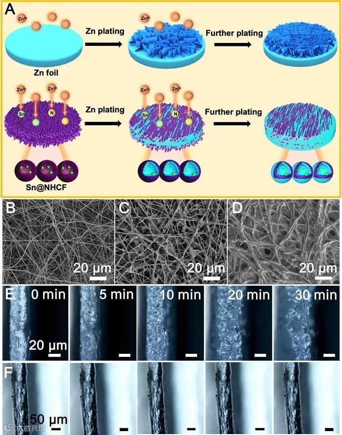 图4. Sn@NHCF和锌箔上的锌沉积行为。(A) 锌在锌箔和Sn@NHCF上沉积的示意图。Sn@NHCF在镀锌前后的FEESM图像,对应面积比容量为 (B) 0 mAh cm-2,(C) 2 mAh cm-2和 (D) 12 mAh cm-2。在10 mA cm-2的电流密度下,在不同时间对 (E) 锌箔和 (F) Sn@NHCF的锌沉积过程进行的原位光学观察。