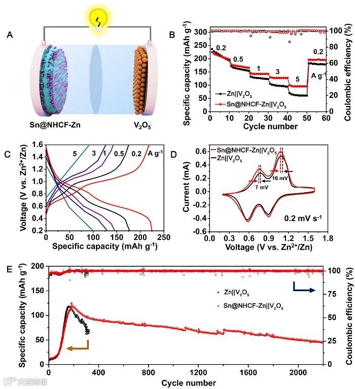 图6. 全电池中不同电极的电化学性能。(A) Sn@NHCF-Zn||V2O5电池的示意图。(B) Sn@NHCF-Zn||V2O5和Zn||V2O5的倍率性能。(C) Sn@NHCF-Zn||V2O5 在不同电流密度下的充放电曲线。(D) CV曲线。(E) Sn@NHCF-Zn||V2O5和Zn||V2O5的循环性能,V2O5的质量负载量为5 mg cm-2。
