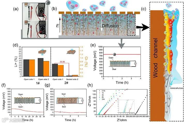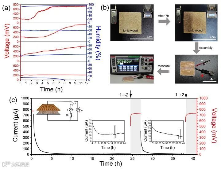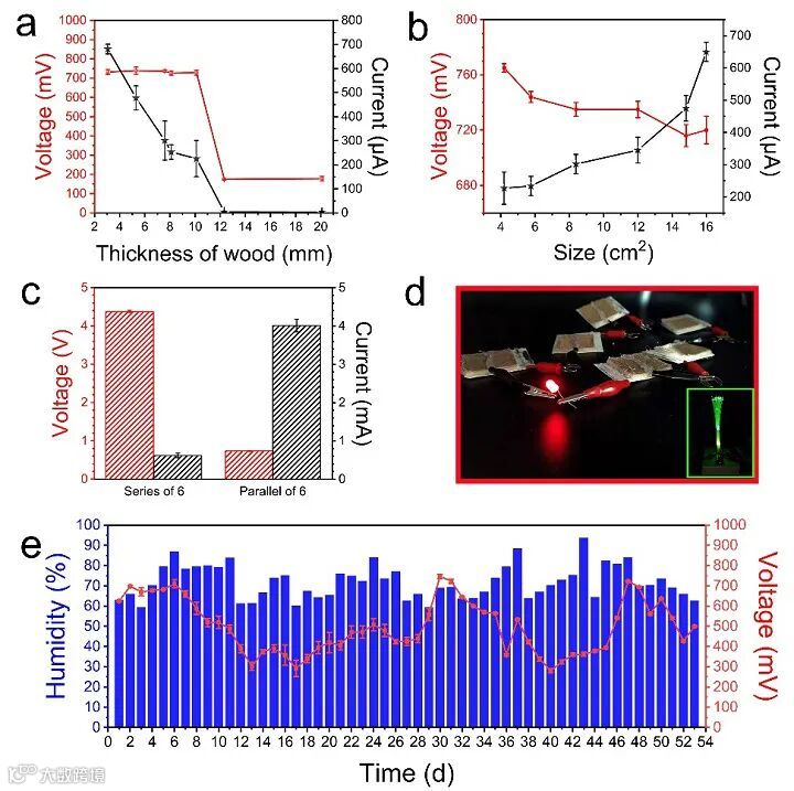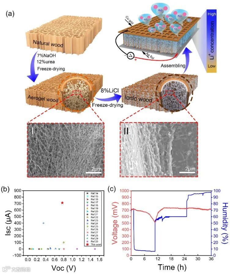 华南理工大学轻工科学与工程学院刘德桃课题组受树木自然生长过程中水分子、离子运输机制启发,开发了一种木材腔壁微纳米表面操纵技术,由天然木材直接加工成了一种特殊的离子木材功能结构,同时还保存了天然木材独特的从上到下能够定向输送离子的微通道,并在腔壁表面形成了一种由纳米纤维素粘连LiCl纳米粒子构建的蜘蛛网状超结构,高效捕集空气水分子,实现高效可持续的离子运输机制,使得自供电设备的电量输出水平及其稳定性方面取得了重大突破。