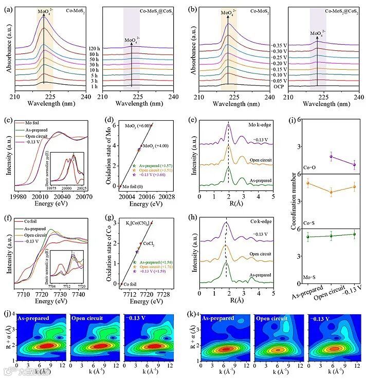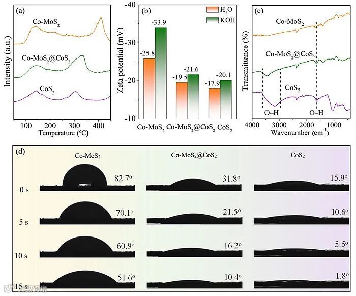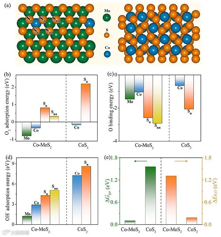 图1. Co-MoS2 (002) 和CoS2(200) 模型的结构示意图以及它们对不同物种的吸附特性