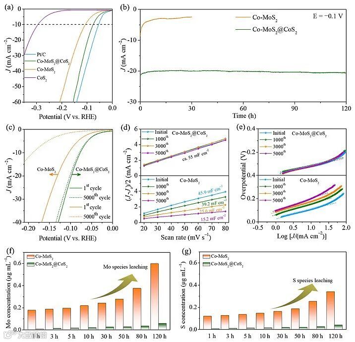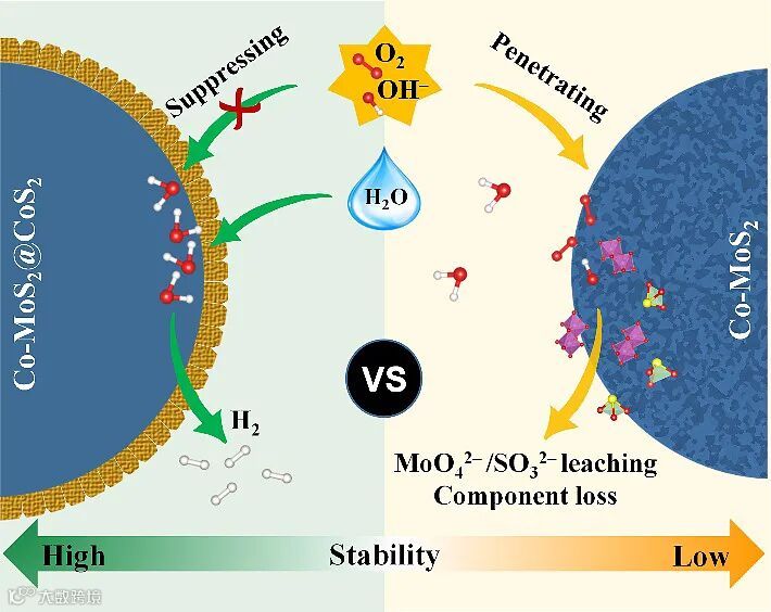 近日,北京理工大学化学与化工学院曹敏花教授课题组在解决电催化剂的活性-稳定性权衡问题方面取得了重要研究进展,相关研究成果在Angewandte Chemie International Edition 杂志上在线发表。论文报道了具有分子选择性的栅栏工程策略,解决了催化剂活性与稳定性之间的权衡问题。这种独特的分子栅栏不仅可以有效地阻断毒化物种侵蚀催化剂,同时又允许与催化反应相关的物种自由地扩散到催化剂表面。采用一步法在高活性的Co 掺杂的MoS2催化剂外表面原位构建了具有分子选择性的CoS2栅栏(Co-MoS2@CoS2),通过分析Co-MoS2@CoS2碱性析氢反应性能,发现这种分子栅栏策略显著提高了Co-MoS2的催化稳定性,并进一步优化了其催化活性。同时,结合密度泛函理论模拟和实验手段,进一步验证了CoS2分子栅栏不仅能有效保护Co-MoS2催化剂免受O2和OH−毒化物种的侵蚀,而且能促进Co-MoS2对H2O分子的吸附,从而抑制MoS2在电解液中的溶解,实现其优异的碱性析氢反应稳定性和活性。这一策略为解决高活性非贵金属基催化剂的活性-稳定性权衡问题开辟了新的前景,并为设计高效、稳定的非贵金属基电催化剂的大规模应用提供了新思路。
