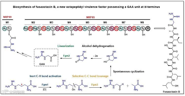 不同于已知的胍基乙酸形成途径——通过脒基转移酶催化甘氨酸和精氨酸之间的亲核取代,禾谷镰孢菌仅利用精氨酸为底物,通过多酶催化的串联反应对精氨酸进行修饰得到胍基乙酸。首先,精氨酸在细胞色素P450蛋白Fgm1存在下对C4位惰性C-H键活化得到4(R)-羟基精氨酸;然后,由PLP依赖的裂解酶Fgm3选择性地催化Cβ-Cγ键断裂得到胍基乙醛和丙氨酸;胍基乙醛不稳定,会自发环化,再经由脱氢氧化得到内酰胺中间体;最后,在金属依赖的水解酶Fgm2作用下水解线性化得到胍基乙酸。胍基乙酸作为非天然氨基酸合成砌块,再被非核糖体合成酶NRPS9识别,通过顺序的NRPS模块化组装得到成熟的非核糖体八肽毒力因子fusaoctaxin B。