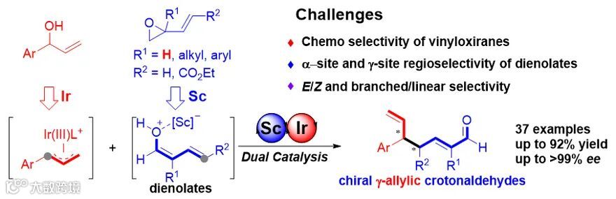 图1. 钪/铱双金属协同催化的原位生成的二烯醇γ-不对称烯丙基化构建手性巴豆醛化合物。图片来源:Angew. Chem. Int. Ed.