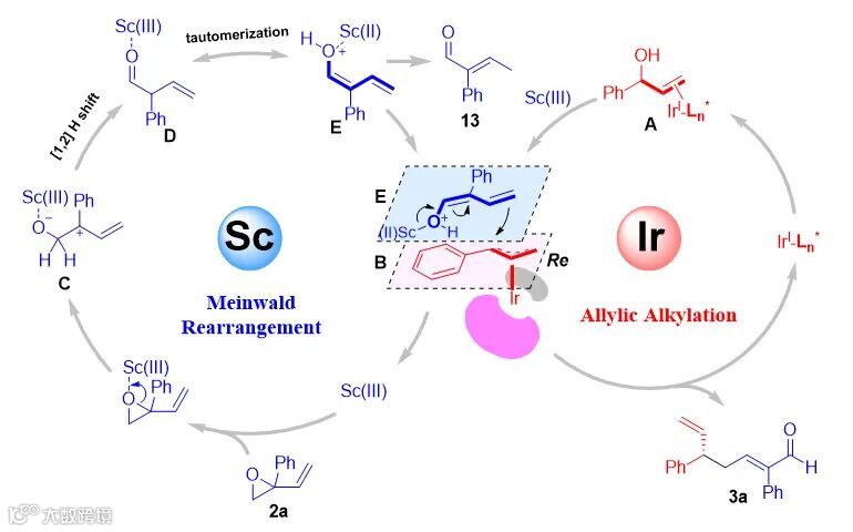 在该反应体系中,简单易得的烯基环氧乙烷在Lewis酸催化下经Meinwald重排能高效地生成二烯醇类化合物,可作为有效的二烯醇亲核试剂前体。但同时其会在过渡金属铱催化下形成氧杂烯丙基铱偶极(Angew. Chem. Int. Ed. 2021, 60, 24941−24949)。这一副反应路径既会对烯基环氧乙烷的Meinwald重排过程造成不利影响,又会抑制烯丙基铱亲电物种的生成,从而导致反应无法进行。因此,如何有效调节Lewis酸催化的Meinwald重排体系和金属铱催化的烯丙基取代体系,使两个催化体系互相兼容,是一个巨大的挑战。另外,两个原位生成的活性中间体之间的反应兼容性和存活时间的匹配性也是个亟待解决的问题。