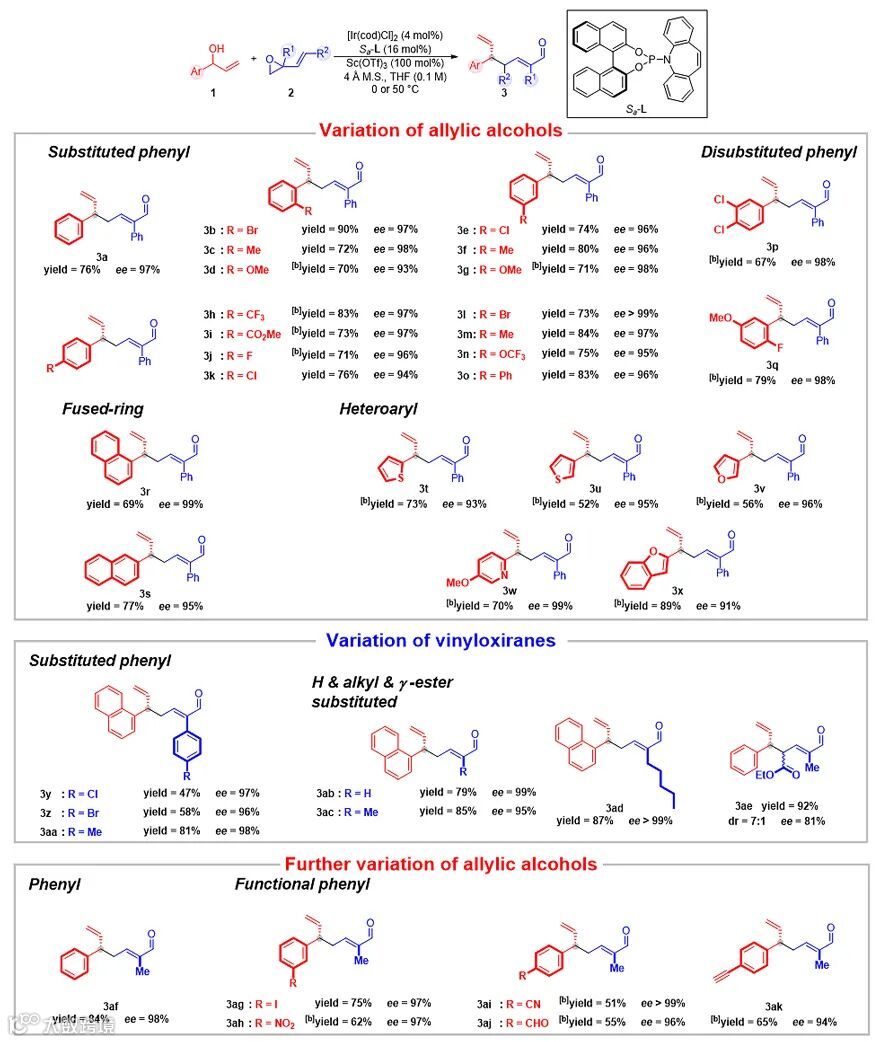 图2. 钪/铱双金属协同催化的原位生成的二烯醇γ-不对称烯丙基化反应底物普适性考察。图片来源:Angew. Chem. Int. Ed.