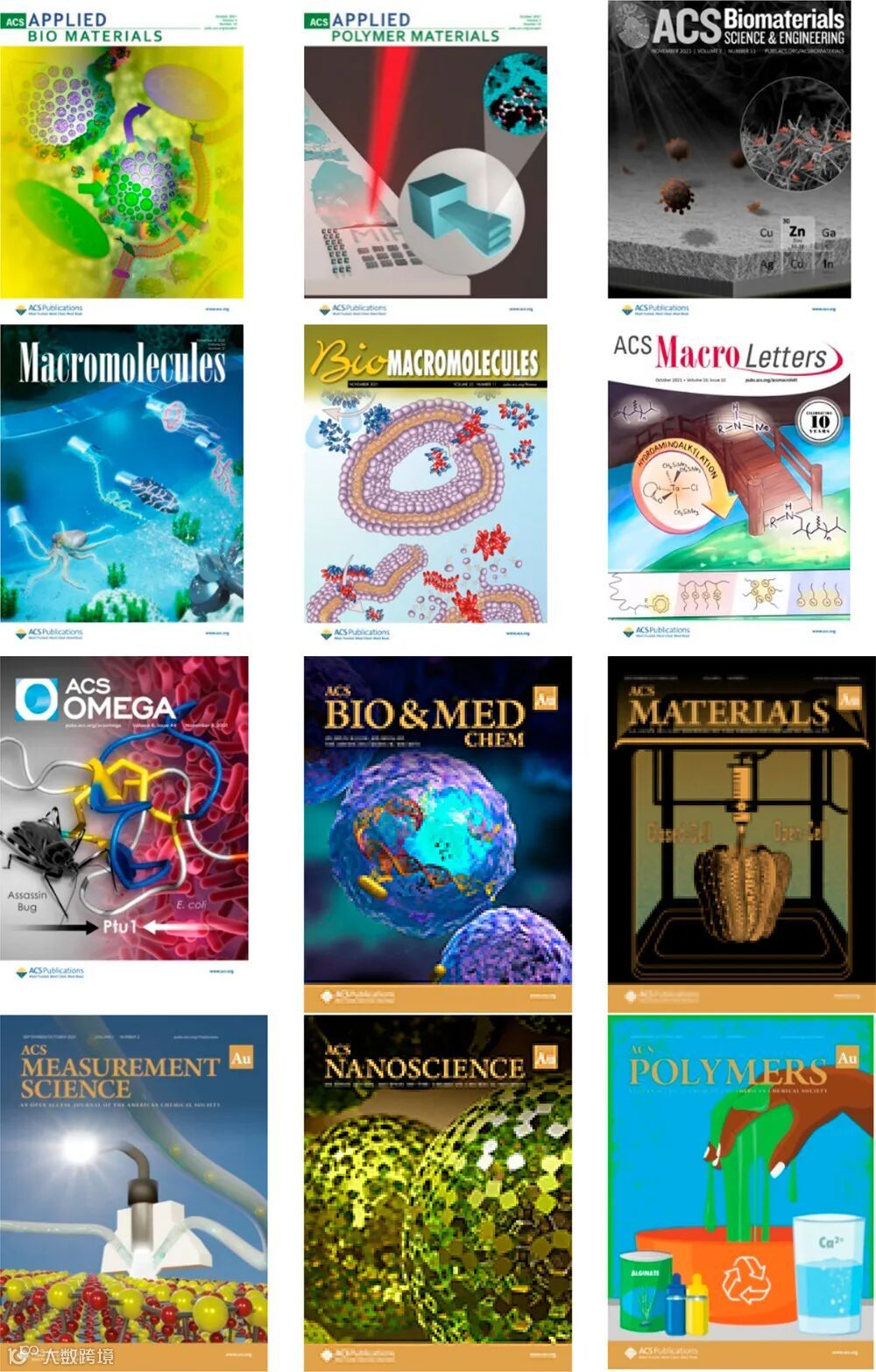 该虚拟专刊精选了一系列极具影响力的高质量并可以免费阅读的文章,文章来自美国化学会各类“生物材料”、“应用材料”和“大分子科学”期刊,以及 ACS Omega。后者是一本出版范围十分广泛的期刊,向上述等领域的相关研究敞开了大门。该虚拟专刊收录的部分论文来自 ACS Applied Bio Materials、ACS Applied Polymer Materials、ACS Biomaterials Science & Engineering、ACS Macro Letters、Biomacromolecules 和 Macromolecules(图1)。同美国化学会绝大多数期刊一样,这六种期刊也采用混合出版模式,不仅包括需购买或订阅方能访问的研究论文,还提供“开放获取”选项,供一切可上网的用户免费获取。这些期刊称作“混合型”期刊。相比之下,ACS Omega是一种完全开放获取期刊。上述七种期刊均有论文入选该联合虚拟专刊。此外,专刊还收录了美国化学会其他新创期刊的论文,包括 ACS Bio & Med Chem Au、ACS Materials Au、ACS Measurement Science Au、ACS Nanoscience Au 和 ACS Polymers Au。这些期刊采用完全开放获取模式,同样欢迎有关生物材料的各类投稿。综合来看,这些期刊覆盖了生物材料领域方方面面的内容,为作者提供了一系列选项,可满足其个人偏好、重点研究方向以及机构或资助人提出的要求。