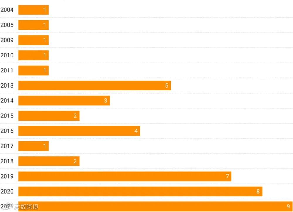 对科睿唯安期刊引用报告(JCR)数据库的分析结果显示,目前收录至“MATERIALS SCIENCE, BIOMATERIALS”(材料科学、生物材料)类索引的期刊共有47种(源自2021年10月25日更新的JCR数据集)。其中大部分期刊都采用了混合出版模式,另有六种期刊采用完全开放获取模式。然而,从开放获取期刊目录(DOAJ;https://doaj.org/)可看出,以开放获取方式出版的生物材料类研究有着显著增长,共有48种完全开放获取类生物材料期刊出现在目录当中。值得一提的是,有24种生物材料类期刊是于最近三年进入 DOAJ 目录的(图2)。