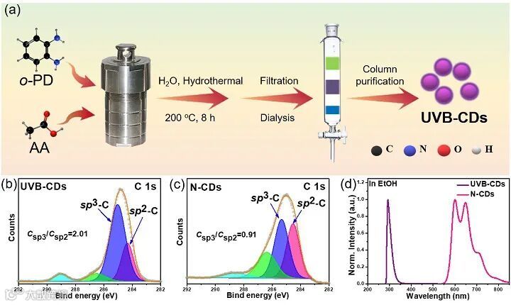 碳点(CDs)是一种新兴的无金属发光纳米材料,由于具有发光可调、优异的光稳定性和低毒性等诸多优点,在能源转换、光电器件和生物医药等领域均具有巨大的应用潜力。然而,目前将碳点作为发光材料应用到UVB器件中仍面临如下挑战:1)发光位于可见光区的碳点已有较为广泛的研究,然而具有紫外波段发射的报道仍然较少,这是由于合成过程中发光中心的共轭尺寸和元素组成难以精确控制;2)碳点的发射峰较宽(半峰宽通常大于80 nm),限制了其在固态照明等方面的实际应用;3)同有机发光分子类似,碳点也普遍存在聚集诱导发光猝灭的现象,这将对相关器件的发光效率和稳定性造成严重影响。