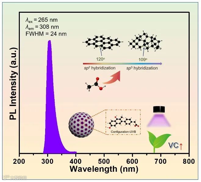 图1. UVB-CDs的发光光谱、发光机理和用于植物照明的示意图。