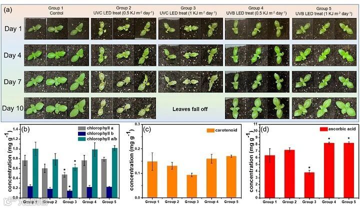 图3.不同紫外光处理后的a)罗勒生长形态、b)叶绿素含量、c)类胡萝卜素含量和d)抗坏血酸含量统计图。每组重复3次,*(p ≤ 0.05)、**(p ≤ 0.01)表示与对照组(组1)的显著差异性。