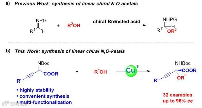 手性N,O-缩醛结构广泛存在于许多合成中间体、天然产物和药物分子的重要骨架中 (图1)。对于某些抗癌候选药物,其N,O-缩醛结构的立体化学性质对于生物活性至关重要。
