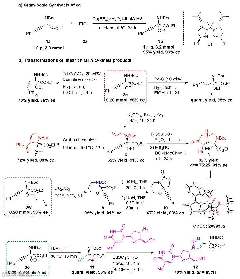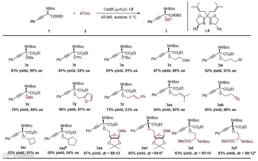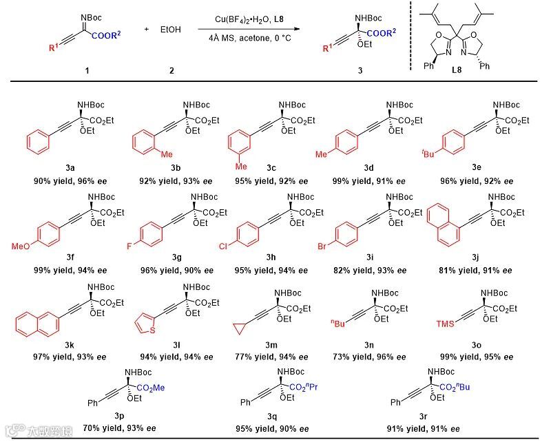 经过铜盐、配体、溶剂和添加剂的筛选后,作者发现反应能够在以Cu(BF)4•H2O和双噁唑啉类配体L8组成的手性催化剂的催化下实现乙醇对于β,γ-炔基-α-亚氨基酯的不对称加成反应,以优秀的收率和对映选择性得到相应的手性链状N,O-缩酮化合物(图3)。