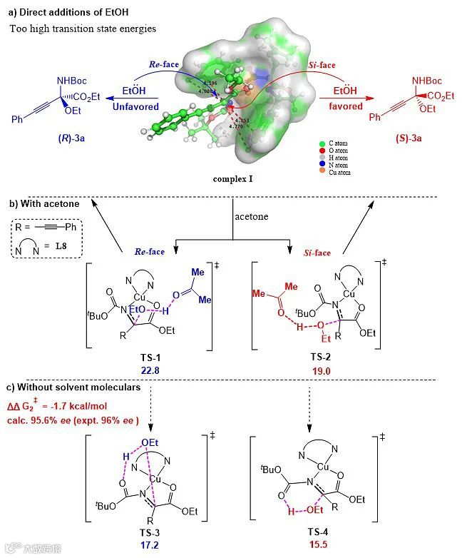 随后,作者利用DFT计算考察了可能的反应路径(图5)。DFT计算显示乙醇分子倾向于从β,γ-炔基-α-亚氨基酯的Si-面进攻C=N双键(图5a)。有趣的是,乙醇分子直接亲核进攻C=N双键的能垒非常高,作者推测在反应体系中β,γ-炔基-α-亚氨基酯N原子上Boc取代基在降低反应能垒上起到了至关重要的作用。DFT计算显示,β,γ-炔基-α-亚氨基酯N原子上Boc取代基的羰基起到了碱的作用,用以攫取醇类中的质子(图5c)。而反应的过渡态TS-3和TS-4的能量也因此分别降至17.2 kcal/mol和15.5 kcal/mol,用此过渡态能量差计算的对映选择性与实验所得对映选择性保持一致。同时,作者考察了N原子上取代基为乙酰基时在丙酮和甲苯中的反应情况,其反应活性与模板底物相比有明显下降,说明了反应中,丙酮或Boc取代基可能起到了碱的作用。