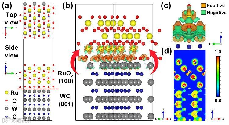 利用密度泛函理论(DFT),经过结构优化及表面能、形成能等结果得出所得到的异质结构可以稳定存在。此外,计算结果表明WC基底中的电子向RuO2中迁移,并聚集在Ru位点,提升活性位点的电子浓度,优化周围位点的电子结构。这些结果证明了RuO2-WC中存在催化剂-基底相互作用(图1)。