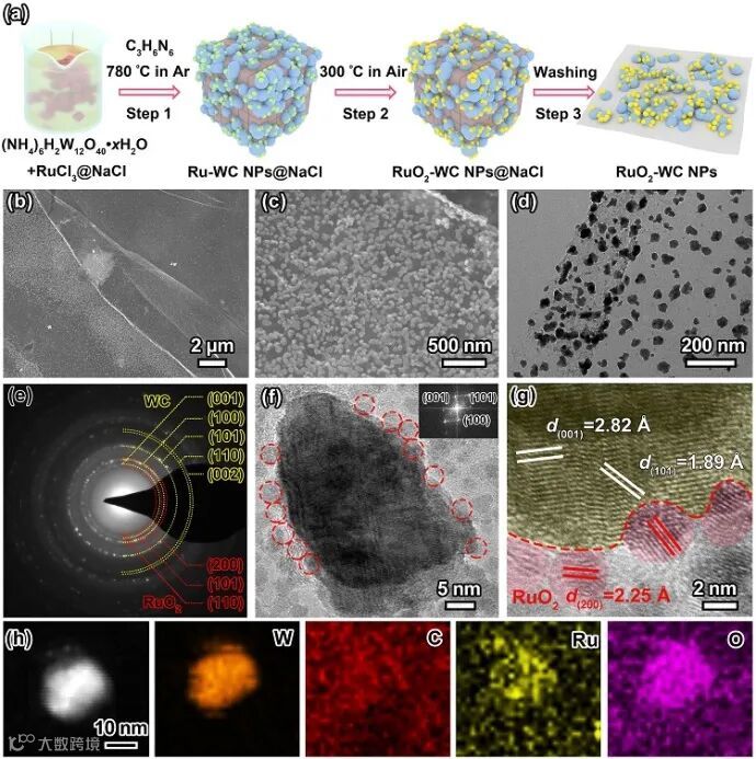 图2. RuO2-WC NPs的合成示意图和微观结构表征。