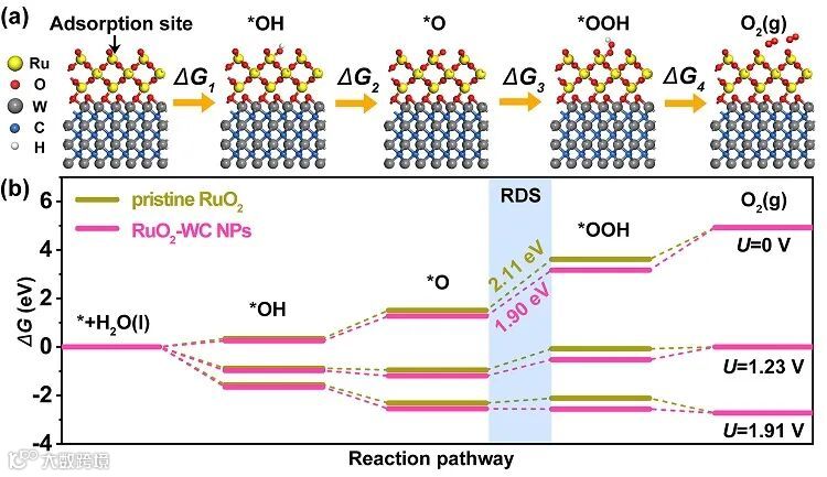图4. RuO2-WC NPs 上 OER 四电子过程吸附模型及反应中间体的吉布斯自由能。
