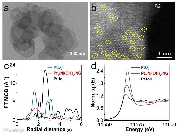 从球差电镜图中可以看到Ni(OH)2/NG上孤立的Pt原子,傅立叶变换X射线吸收精细结构谱(EXAFS)中只存在Pt-O键,不存在Pt-Pt键,证明了Pt单原子的存在。通过XPS发现,Pt的价态在0-+4价之间,且Pt1/Ni(OH)2/NG中Ni的价态比Ni(OH)2/NG的更高,表明Pt与Ni之间有强烈的电子相互作用。