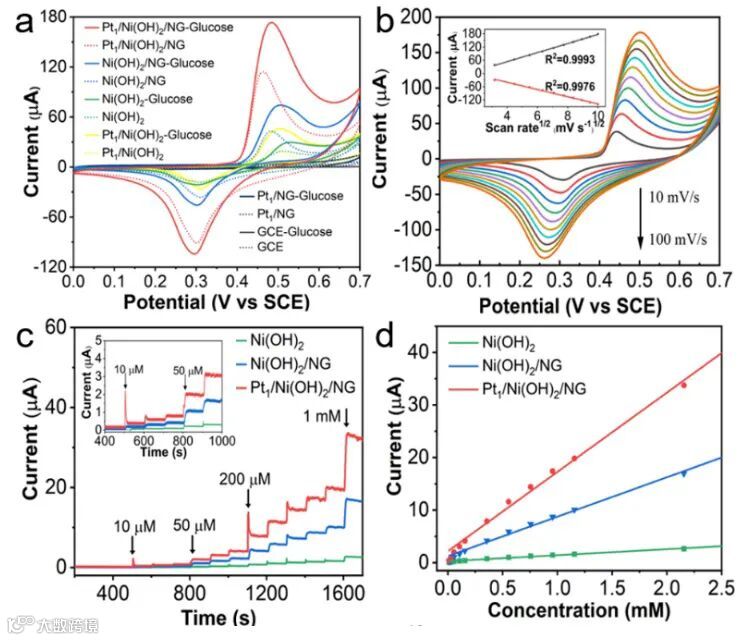 此外,Pt1/Ni(OH)2/NG表现出更低的葡萄糖氧化电位,并且在0.01 mM至2.18 mM范围内表现出最佳的线性关系 (R2=0.992) 和最高灵敏度 (220.75 μA mM-1 cm-2)。同时, Pt1/Ni(OH)2/NG对葡萄糖还具有优异选择性和长期稳定性。电化学阻抗谱中,Pt1/Ni(OH)2/NG的电荷转移电阻低于Ni(OH)2,说明高导电的NG促进Pt1/Ni(OH)2/NG的电子转移能力。