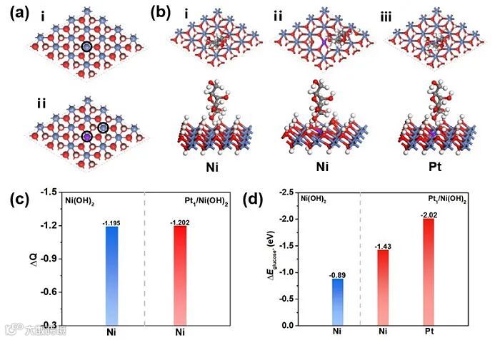 DFT计算表明,Pt单原子诱导的Ni原子上的正电荷更多,表明单原子Pt和Ni(OH)2之间存在强电子相互作用。单原子Pt上更强的葡萄糖吸附强度表明Pt单原子是活性中心。此外,Pt1/Ni(OH)2中Pt单原子附近的Ni位点也表现出比原始Ni(OH)2更强的葡萄糖结合能。因此,Pt1/Ni(OH)2/NG对葡萄糖氧化的高活性可归因于Pt单原子、Ni(OH)2和NG的协同催化作用。