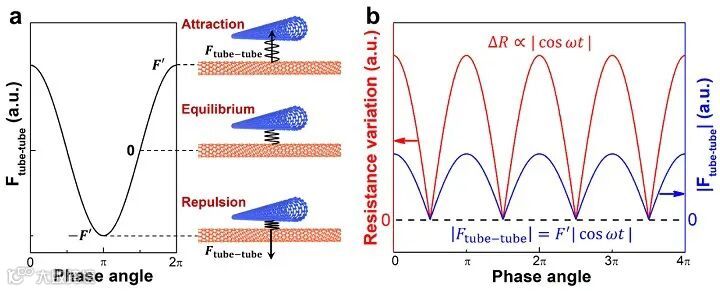 在此背景下,清华大学张如范副教授课题组设计了一种基于悬空碳纳米管网络(SCNTNs)的高性能气流传感器。SCNTNs由浮游催化化学气相沉积的方法一步合成,并在表面修饰了焦油纳米颗粒,以达到碳纳米管的光学可视化、稳定网络结构和增强气流曳力三方面作用(图1)。SCNTNs所具有的超轻的结构和极高的柔性使其具有优于大多数气流传感器的传感性能:0.021 s的超短响应时间(目前报道中最短)、0.0124 s m-1的高灵敏度、0.11 m s-1的低检出限和0.11~5.51 m s-1的宽检测范围(图2)。此外,在声学测试中,SCNTNs显示出了长达2亿次的超长循环寿命,而没有明显结构破坏。为揭示SCNTNs的传感机理,作者设计了一套声学测试系统以获取SCNTNs在声波作用下的电学响应。通过分析电信号的频率和振幅,结合碳纳米管受迫振动的数学模型,作者发现了碳纳米管的电阻变化与网络结点处的管间应力之间具有强相关性。在声波作用下,碳纳米管结点处的管间应力表现出简谐振动的行为,从而会使碳纳米管在结点处周期性地偏离其平衡位置,进而导致结点电阻增加并产生电学响应(图3)。