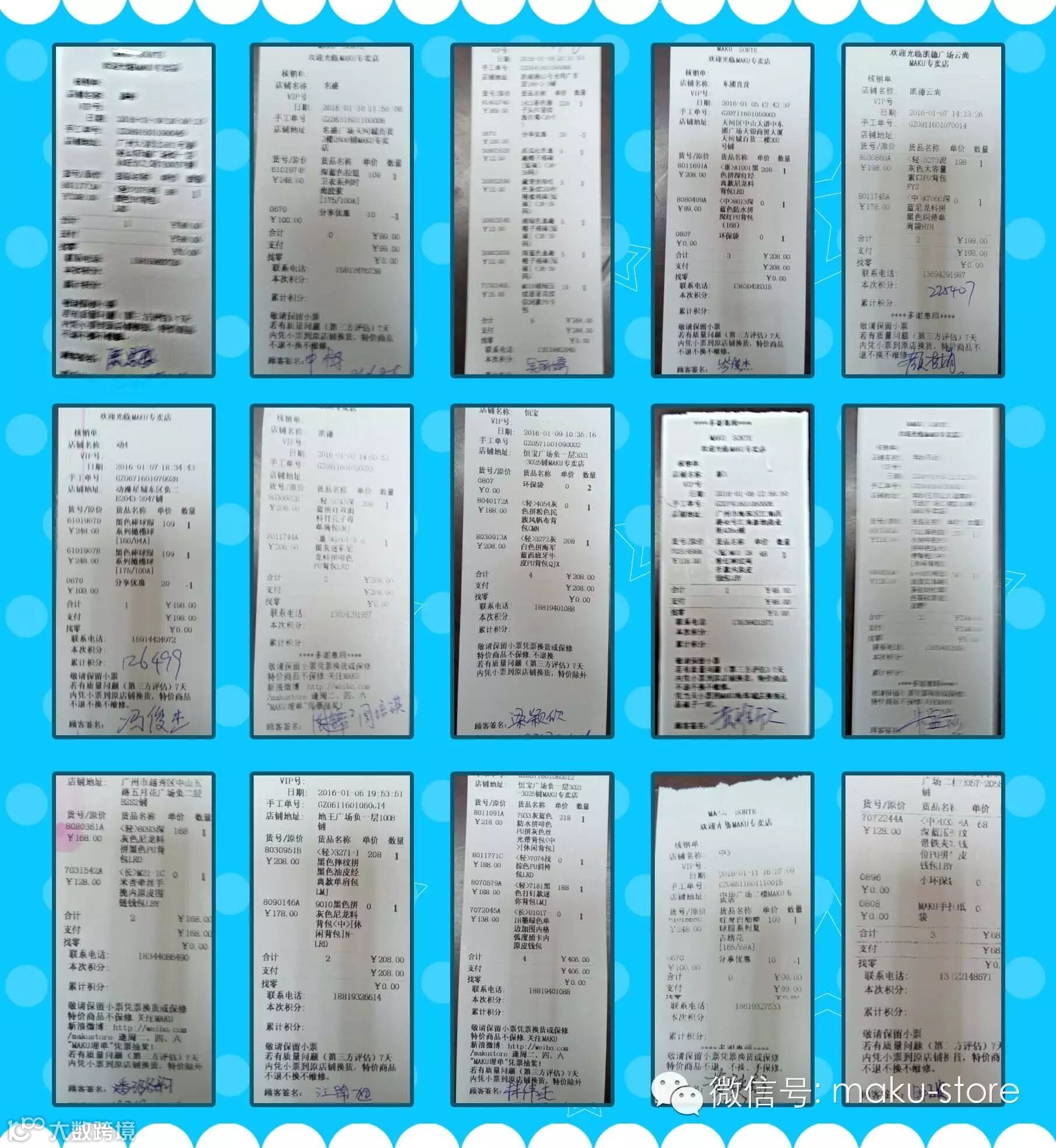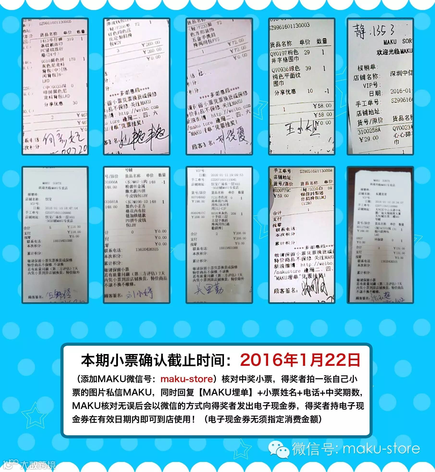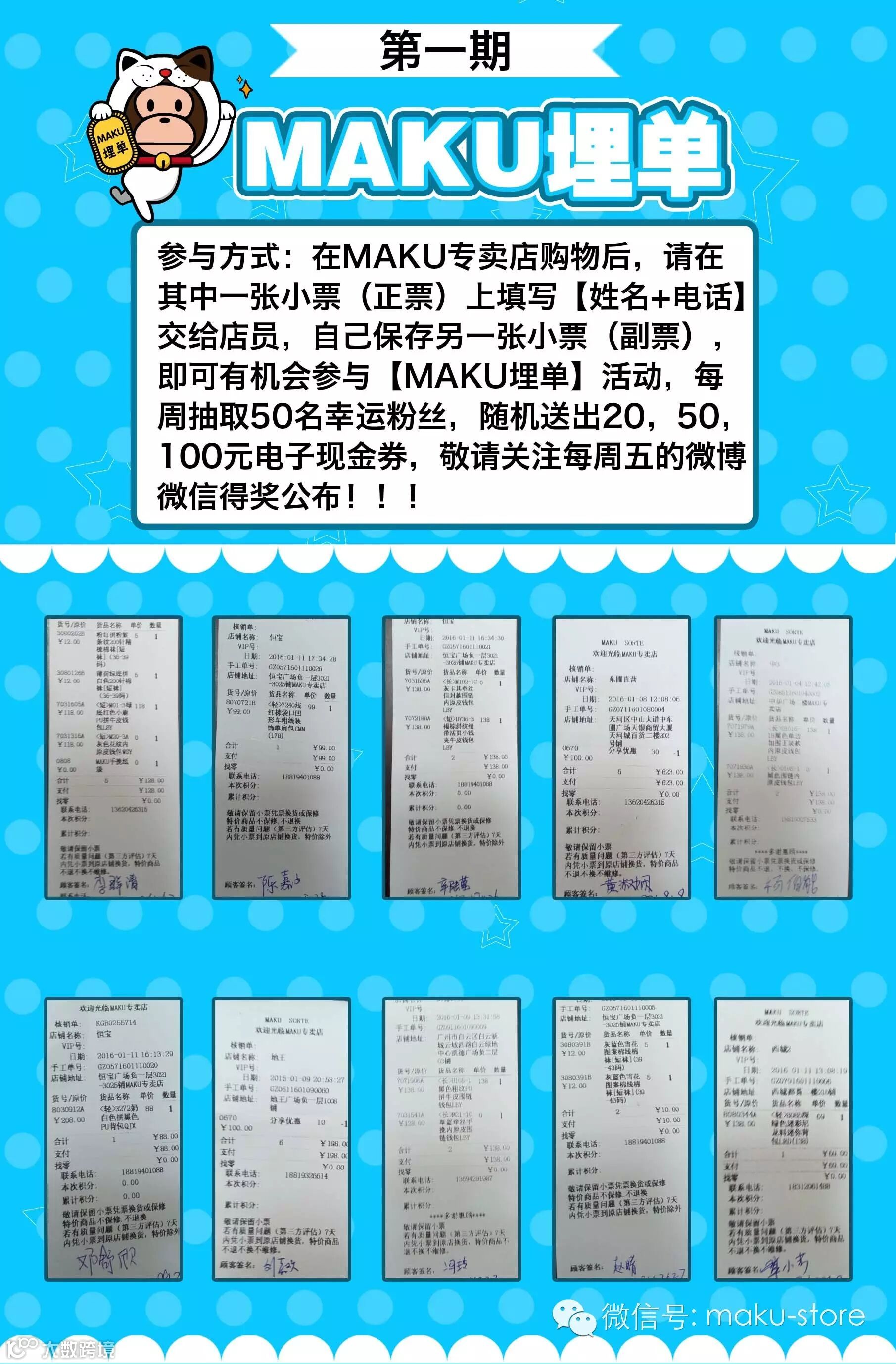 在MAKU专卖店购物后,请在其中一张小票(正票)上填写【名+电话】交给店员,自己保存另一张小票(副票),即可有机会参与【MAKU埋单】活动,每周抽取50名幸运粉丝,随机送出20,50,100元电子现金券(电子现金券无须指定消费金额),敬请关注每周五的微博微信得奖公布!!