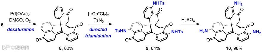 与此同时,作者从三羰基化合物8出发,借助铱催化碳氢键酰胺化方法,实现了三根碳氢键的同时酰胺化,再经水解,以高效率获得了Dalesconol A的氨基类似物10,为相关生物活性研究提供了更加便捷的途径(图5)。