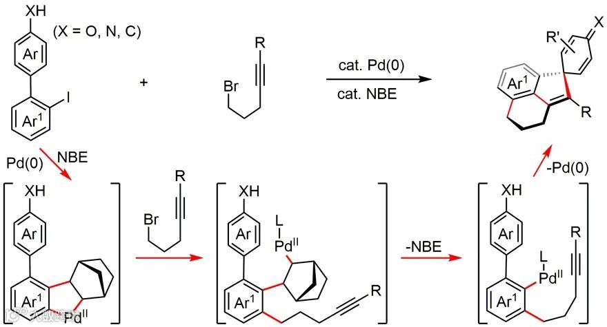 图1. Pd(0)/NBE协同催化的三重多米诺反应