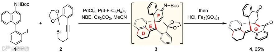 环化阶段:作者选用简单易得的底物1和2,在Pd(0)/NBE催化条件下生成六环中间体3,随后经酸处理,通过一步化学操作,以65%产率获得了目标七环产物4(图3)。