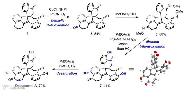 氧化阶段:作者利用铜催化对化合物4苄基位进行选择性氧化,再以钯催化一步三羟基化的方式获得高级中间体7,最终通过钯催化氧气氧化的方法实现了Dalesconol A的全合成(图4)。