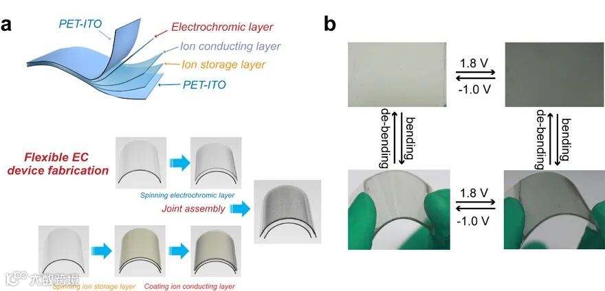 图2. 双稳态电致变色器件及在柔性透明显示中的应用。图片来源:Adv. Mater.