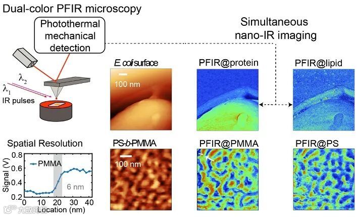 许晓汲团队将这项新技术应用于聚苯乙烯(PS)和聚(甲基丙烯酸甲酯)(PMMA)共混物、嵌段共聚物(PS-b-PMMA)和细菌细胞大肠杆菌(E. coli)的检测。首先,作者以PS/PMMA共混物作为标准样品对Dual-color PFIR进行测试,在同一扫描范围内同时采集到PMMA和PS的红外图像,与之对应分别测到了PMMA和PS位点的红外光谱;随后,在PS-b-PMMA样品上证明了Dual-color PFIR具有与普通PFIR接近的6 纳米超高空间分辨率。接着,作为生物成像应用的探索,Dual-color PFIR,作者在E. coli样品上分别得到了脂质和蛋白质,蛋白质和核酸分布的双色红外图像,用不添加化学探针的成像方法证明了E. coli细胞膜分布着的脂质、蛋白质和核酸物质。最后,进一步放大E. coli的局部范围,除了得到检测多糖,脂质和蛋白质的成像分布之外,作者还扫描了在相应不同位点的红外光谱图进行对比,表明了E. coli样品表面不同位点化学组成的差别,证明了该技术在纳米尺度上研究生物样品的化学异质性的能力。