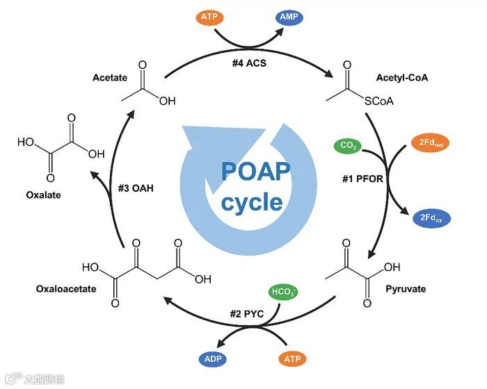 研究人员通过进一步的合成测试,获得了构建POAP循环所需要的其他三个酶PYC、OAH和ACS。然后采用先分别构建POAP半循环、再将两个POAP半循环整合在一起的策略,构建了具有功能的POAP循环。以13C标记的碳酸氢钠为底物进行测试,成功检测到POAP循环的产物13C标记的草酸,并测定出POAP循环的二氧化碳固定速率为8.0 ± 1.8 nmol CO2/min/mg固碳酶,草酸的转换数为5 摩尔/摩尔POAP循环酶,固碳效率较高。