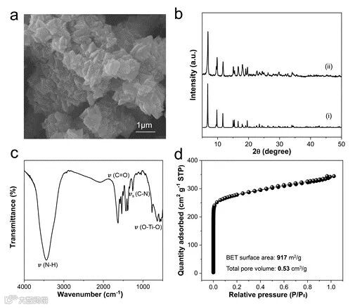 图3. 以TiS3作为金属源制得的NH2-MIL-125(Ti)粉末结构表征