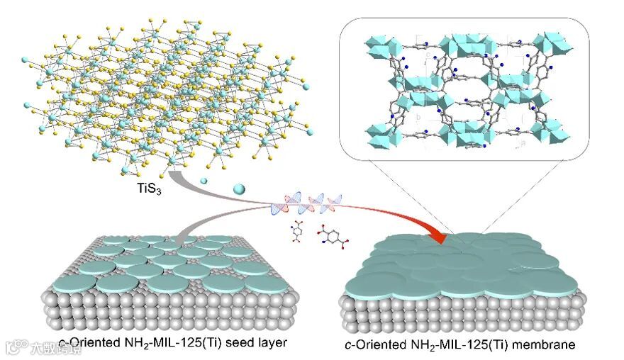 近日,大连理工大学刘毅教授团队和中山大学罗惠霞教授团队、台湾中山大学林仕鑫教授团队合作,结合晶种层的取向沉积与可控的外延生长,制备了具有高度c轴取向的超薄NH2-MIL-125(Ti)膜。如图1所示,在单模微波辅助二次生长过程中,TiS3被用作 NH2-MIL-125(Ti) 的钛源。由于TiS3具有适中的Ti-S键强度和稳定性,能在较温和的反应条件下进行溶剂热反应,从而形成无孪晶且高度c轴取向的超薄NH2-MIL-125(Ti)膜。