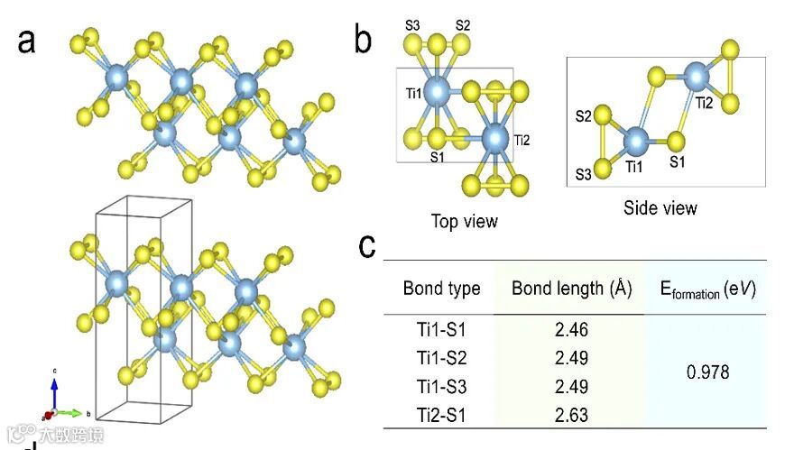 TiS3作为一种典型的过渡金属三硫化物 (TMTC) ,相较于TiS2具有同样的层状结构,Ti-S键键长更长(图2)。密度泛函理论 (DFT) 计算结果表明其形成能更低 (0.978 eV)。因此推断,TiS3在溶剂热条件下更易受到NH2-BDC配体的亲核攻击,促使钛物种在温和的反应条件下释放到反应溶液中,从而同时实现NH2-MIL-125(Ti) 晶粒充分连生、孪生有效抑制和膜厚显著调控。
