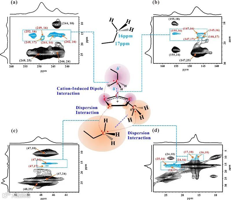 研究团队利用二维13C-13C空间偶极相关谱固体NMR实验技术,研究了丙烷、甲醇以及乙烯等在含有环戊烯碳正离子ZSM-5分子筛上的吸附。如图1所示,丙烷的甲基以及亚甲基和环戊烯碳正离子的正电荷基团以及烷基基团都具有空间邻近性和相互作用;其中丙烷与正电荷基团的相互作用为阳离子-诱导偶极相互作用,而丙烷与烷基基团的相互作用定义为色散相互作用。相较而言,阳离子-诱导偶极相互作用强度要大于色散相互作用。此外,甲醇和乙烯与环戊烯碳正离子也产生了较强的相互作用,分别由阳离子-偶极相互作用和阳离子-π相互作用占据主导。
