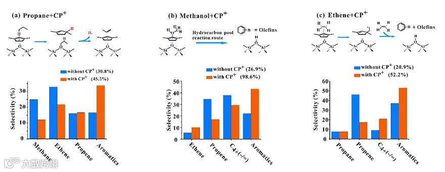 图2. 丙烷、甲醇和乙烯与甲基环戊烯共进的反应结果。甲基环戊烯作为环戊烯碳正离子前驱体,很容易在分子筛上形成环戊烯碳正离子(CP+)。