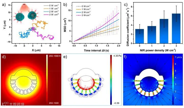得益于其独特的结构与优异的光热性能,APHC被用作近红外光驱动的纳米货车。如图5所示,在近红外光照射下,其运动速率快速增加。通过对比实验,作者推测其运动机制包括自热泳驱动以及内部溶液通过孔道流出产生的反推力驱动,并通过有限元模拟分析进一步进行了探究。结果显示不对称结构结合光热性能产生的温度梯度将导致其进行自热泳运动,另外,内部溶液被加热后密度增加导致其从一侧的孔道处流出,其产生的反推力将推动纳米货车运动。